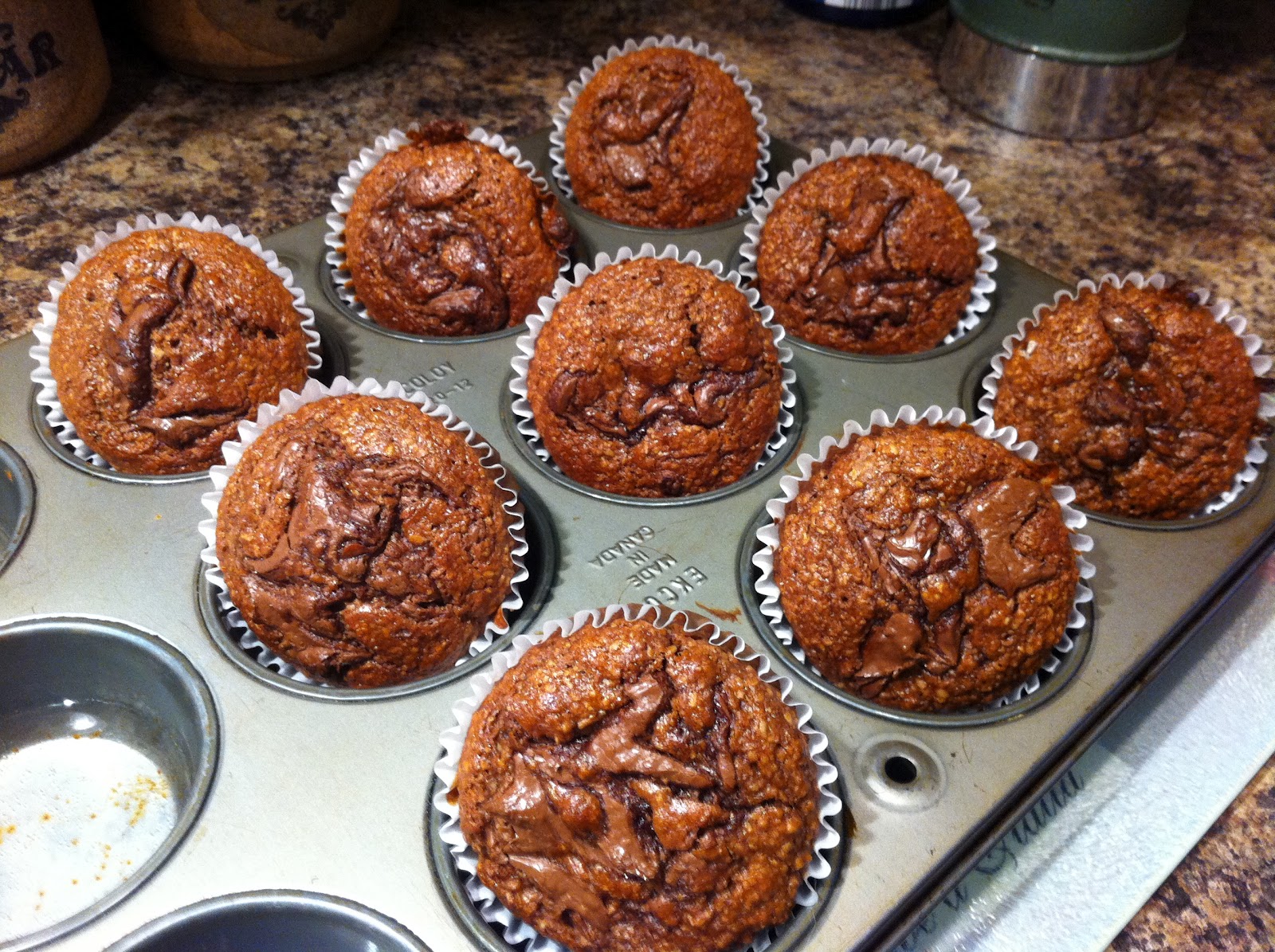 ~Drop 1-2 tsp of nutella onto top of each muffin and swirl around with a toothpick (this didn't work so well for me. It really just clumped, but don't worry it ended up looking fine and still tasting good.)