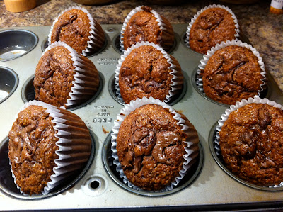 Okay, so these are the bran muffins that I most definitely will be adding to my make again muffin collection. They are great. They're moist and wonderful and have a hint of healthiness mixed in with a side of nutella. Unfortunately, nutella has dairy in it and so I halved this recipe (and still got 9 fair sized muffins) and made another type of dairy free muffins for the lactose intolerant among us. Next time, I might make the full batch but split it and add peanut butter to half and nutella to the rest, to save me having to make two batches one after the other. There's nothing worse than having to wash bowls you just used, to then go and dirty them again. The other thing I did for this recipe was I substituted some whole wheat flour for all purpose. Usually I split it and do half and half, but for this recipe I did 1 C. Whole Wheat Flour and 1/2 C. All Purpose. Eventually I'm trying to completely eliminate all purpose flour, but I don't want to make a complete swap right away on a recipe, because of the weight difference between the two flours. I'm also just realizing now as I type this that I swapped out the buttermilk for some vanilla soy milk with a bit of lemon juice added in to make it buttermilk-like. Oops, I guess I'm so used to not cooking with dairy milk, that even when other ingredients aren't dairy free, I still reach for the soy milk. Ha! I didn't even realize I did that until just now, some 4 days after the fact. I won't keep you from this recipe any longer.