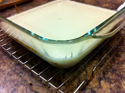This recipe made its way around the food blog world a while ago and I am glad I finally got around to making it. I had high hopes at the beginning for this brownie (yellowie??) but when I pulled it out of the oven I was a little disappointed. It took forever for everything to cool and the glaze to set, and so finally I just gave up and dug in. I had to find out what it tasted like. Well, it has the taste of a typical lemon square (you guys all know the one I'm referring to right? With the shortbready crust and the lemon-eggy mixture on top), but without all the hassle. This really only did take mere minutes of active kitchen time, which disappointed me. I had just had two days that I had not made anything and I was going through withdrawal and then this only took ten minutes. There was no way that only 10 minutes of baking was going to cure my kitchen withdrawal symptoms. So my solution, make two things in one night. Anyway, when I say I was disappointed with this recipe, I in no way mean I was disappointed with the taste or look of this square. It even tasted better the following day right out of the fridge.