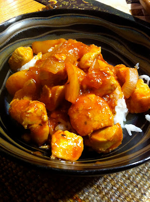 Then I stumble upon this recipe that I put on my 'to-make list' ages ago and just finally got around to doing so. The funny thing is, I had no idea that I was going to be making sweet and sour chicken. I thought it was going to be more fruity salsa like. Well, I was oh so deliciously wrong. This recipe turned out amazingly. Next time I might make one substitution though. Instead of using canned peaches, I might just substitute in an equivalent amount of pineapple. It would add a bit more of a kick to this sauce, and cut through a bit of the sweetness I think. Or I could just might omit the 1/2 Tbsp of sugar. Even though I was sceptical about adding it in because I thought the sauce would be sweet enough, I still did, but at a significantly reduced amount. I probably should have just gone with my gut instinct though.