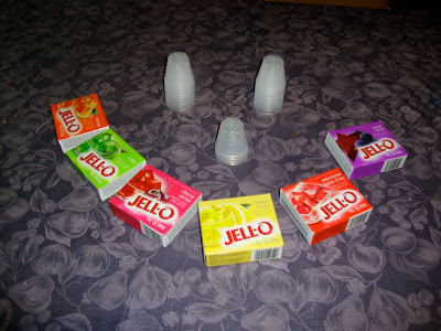 I spent a bit of time trying to track down some containers to make the shots in. Everyone I know said just use dixie cups, but I didn't want to have a tiny bit of jello in a large paper cup. Finally I tracked down something perfect. Medicine cups. You know the little plastic 1 oz cups that come with the children's liquid Tylenol, etc. Well, I didn't go and buy 100 bottles of Tylenol to get all the medicine cups. I work at a pharmacy, and what do you know, you can buy those handy little, multipurpose things by the 100 pack. You know what's even better? They cost me under a buck for the whole sleeve. Now before you go and judge me, I must inform you that I wasn't the only one scooping up a few sleeves of these things. And it wasn't just medicine cups either. One girl was eyeing up some 20 & 30 ml oral syringes that she was going to try and experiment with. The verdict's still out on whether they worked or not.