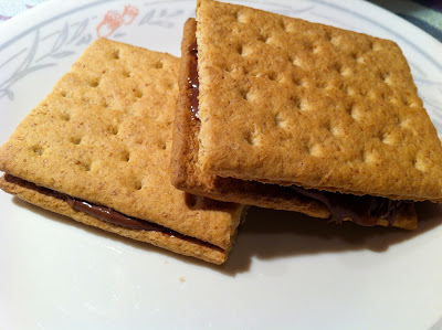 Usually about part way through the summer a fire ban gets put into effect and we don't get to have any more campfires until the weather turns wet and cool again. Unfortunately, we have now survived 2 summers in a row where there has been no ban (meaning it's been too cold and wet out). Typically though we get our s'more fix from February to June (yes February, you read that right, we have some of our best fires when we're celebrating that's it's not snowing out, even though I love the snow. Run on sentence much?) Anywho, sometimes in August when I'm up at the cabin and just want a s'more that I can't have (and I don't want to roast one on the BBQ because it's just not the same), I have this little treat. It's really simple. Nutella and graham wafers. Nutella on the graham wafer and a wafer on top and squish. Mmm, because really, the marshmallow is not the best part of a s'more in my opinion. All it does is melt the chocolate (which is what you really want), but because the Nutella is not a solid, you don't need a hot marshmallow. So problem solved in an oh, so delicious way.