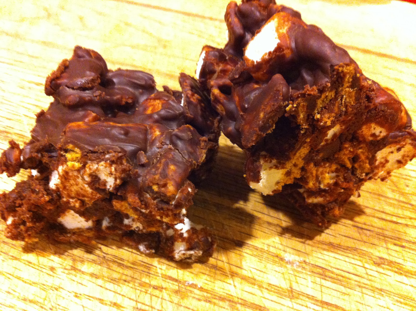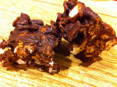 Now to most of you, these may not look inside-out, but to me they do. Let me explain. My Mom makes a s'more square that is basically the same as Rice Krispie square, just with Golden Grahams. So she melts the marshmallows and stirs in the chocolate chips and cereal. The reason I don't make that type of square is because I really struggle timing it right. I either end up with marshmallow goop that is cooled too much and so nothing will mix into it, or too hot and so the chocolate melts and instead of having chocolate chips, you get a gooey chocolate flavoured marshmallow mess. So, this recipe is a lot safer for me (but I'd still like to share the recipe for her S'more Square, I'll just snap a picture of it one day when she makes it to show you). It's safer because you have melted chocolate and whole marshmallows (instead of melted marshmallows and whole chocolate chips - see, inside-out) and marshmallows need a lot more heat to melt than chocolate does (or so I've experienced).