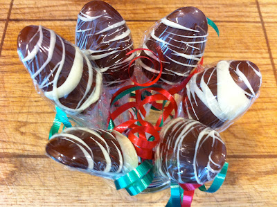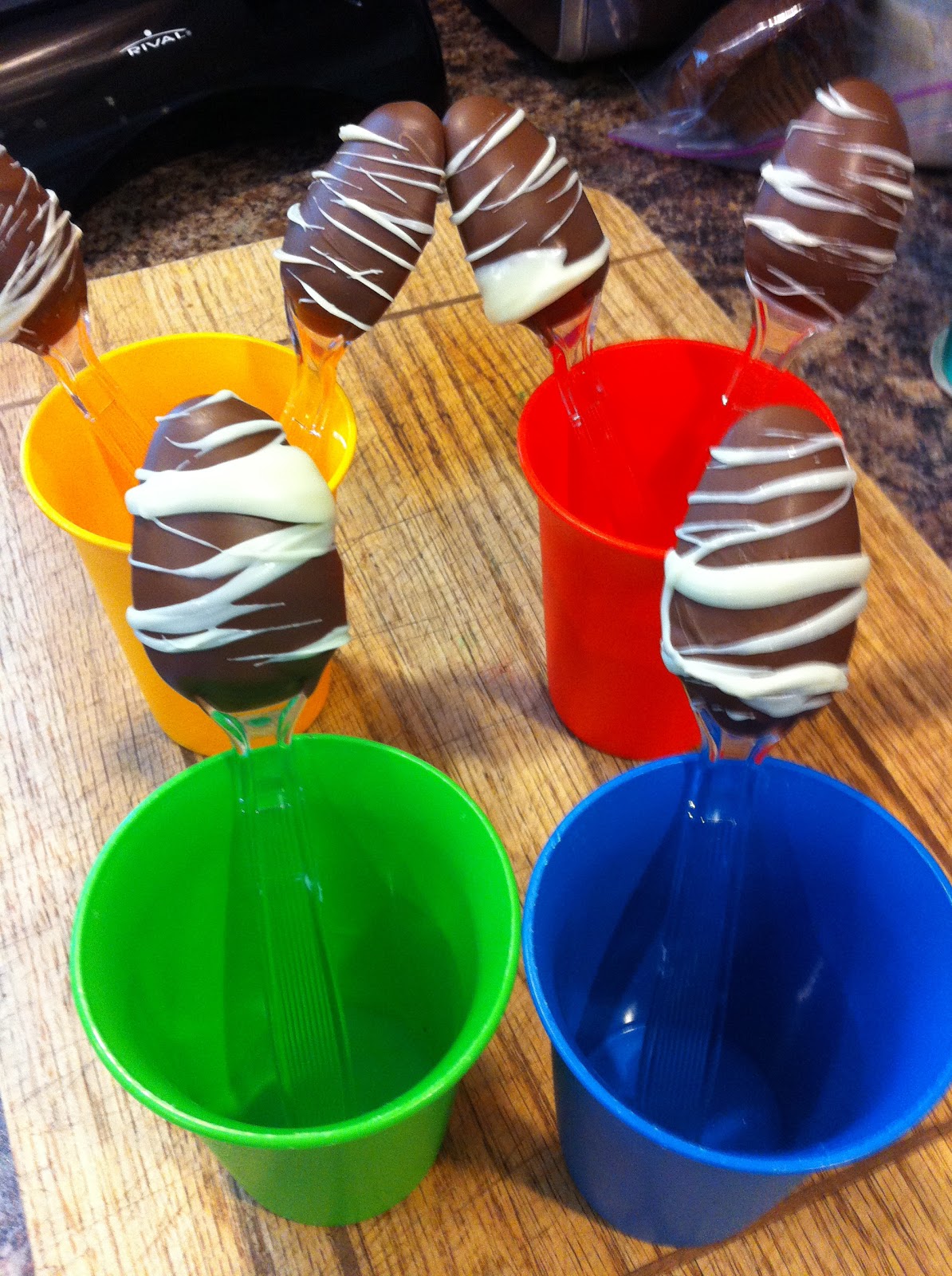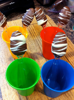 To make these, all you need is plastic spoons and dipping chocolate (and it helps if you have something to stick the dipped spoons into to hold them while they set, instead of having to hold them like I did for quite awhile before I stuck them in the cups to hold them as you can see).