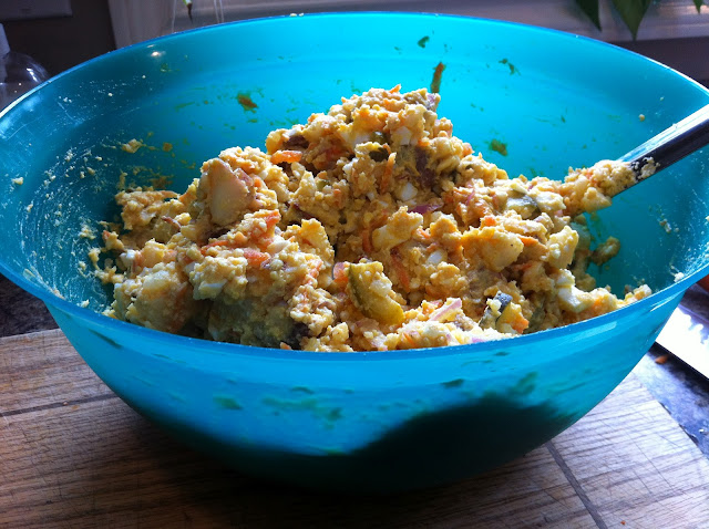 So here it is...Mayonnaise Free Potato Salad...or...Multicoloured Potato Salad...or maybe better yet...Kitchen Sink Potato Salad!