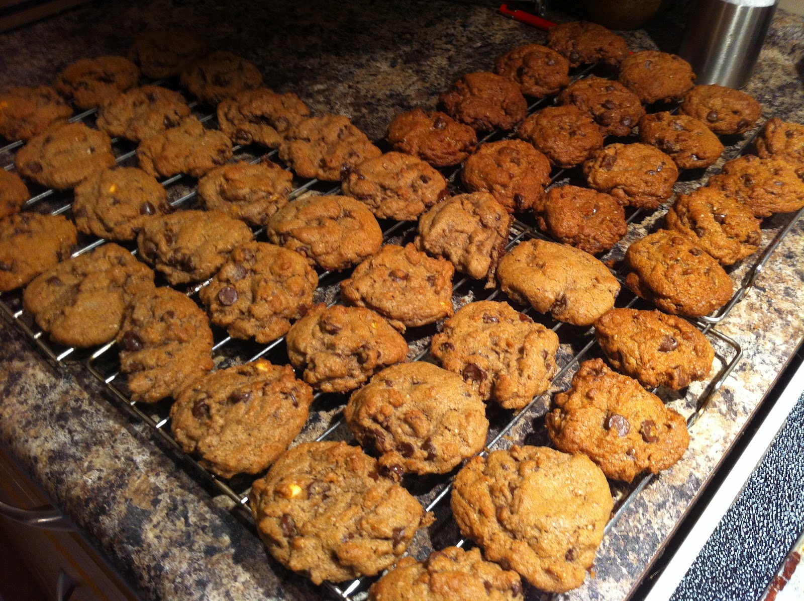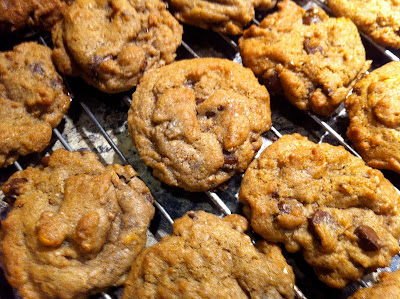 Back to the food. I didn't like these cookies. Then I still didn't like them. But then I really liked them. At first I found them to be lacking something. But, maybe that was just because I was comparing them to what I believe is my favourite chocolate chip cookie which have so much flavour. Well, then these cookies didn't get eaten all that quickly so I threw them in the freezer, because even stale or bad cookies come out of the freezer tasting better. Well, frozen they weren't wonderful either so I stopped eating them but didn't throw them out (I guess I had hope for these poor suckers.) Then a few days ago we were out of cookies, except for some really bad oatmeal ones (I don't know why I made them, I'm not even fond of oatmeal cookies, but I had a craving for them), and so I pulled the container out of the freezer one more time...and they were good. Actually, better than good. Now I don't quite know what it is. Maybe it's just that at first I was comparing them to the best cookies and then by the end it was a comparison with the worst cookie. Or as I'm sitting here I'm remembering that I really overcooked the first couple of trays of these cookies. Maybe all the cookies on the top layers of the container were the overcooked ones, and now I'm getting to the normal ones. Or, maybe it's just a little of both.