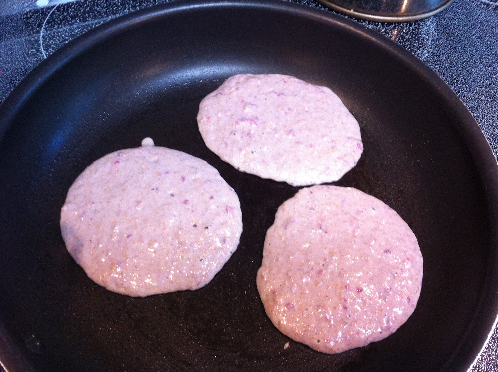 ~Scoop batter (I used a 1/3 C. measuring cup to transfer the batter) onto a hot and greased griddle or skillet.