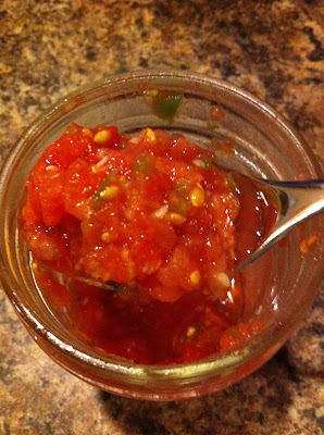 ~Quarter the skinless tomatoes and squeeze juice and seeds out into a bowl. Reserve liquid for later (may need it if salsa is too thick).