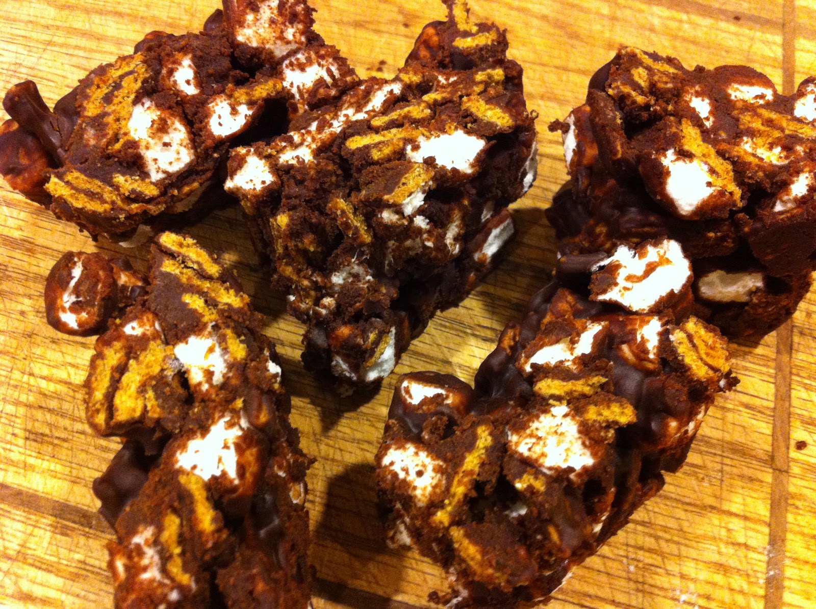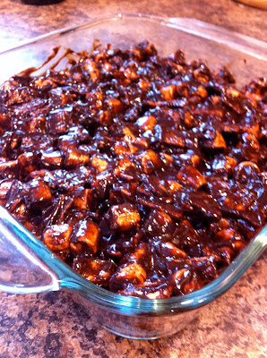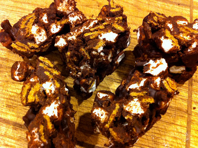 Now to most of you, these may not look inside-out, but to me they do. Let me explain. My Mom makes a s'more square that is basically the same as Rice Krispie square, just with Golden Grahams. So she melts the marshmallows and stirs in the chocolate chips and cereal. The reason I don't make that type of square is because I really struggle timing it right. I either end up with marshmallow goop that is cooled too much and so nothing will mix into it, or too hot and so the chocolate melts and instead of having chocolate chips, you get a gooey chocolate flavoured marshmallow mess. So, this recipe is a lot safer for me (but I'd still like to share the recipe for her S'more Square, I'll just snap a picture of it one day when she makes it to show you). It's safer because you have melted chocolate and whole marshmallows (instead of melted marshmallows and whole chocolate chips - see, inside-out) and marshmallows need a lot more heat to melt than chocolate does (or so I've experienced).