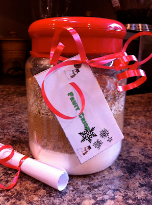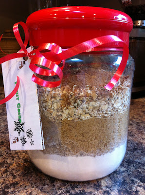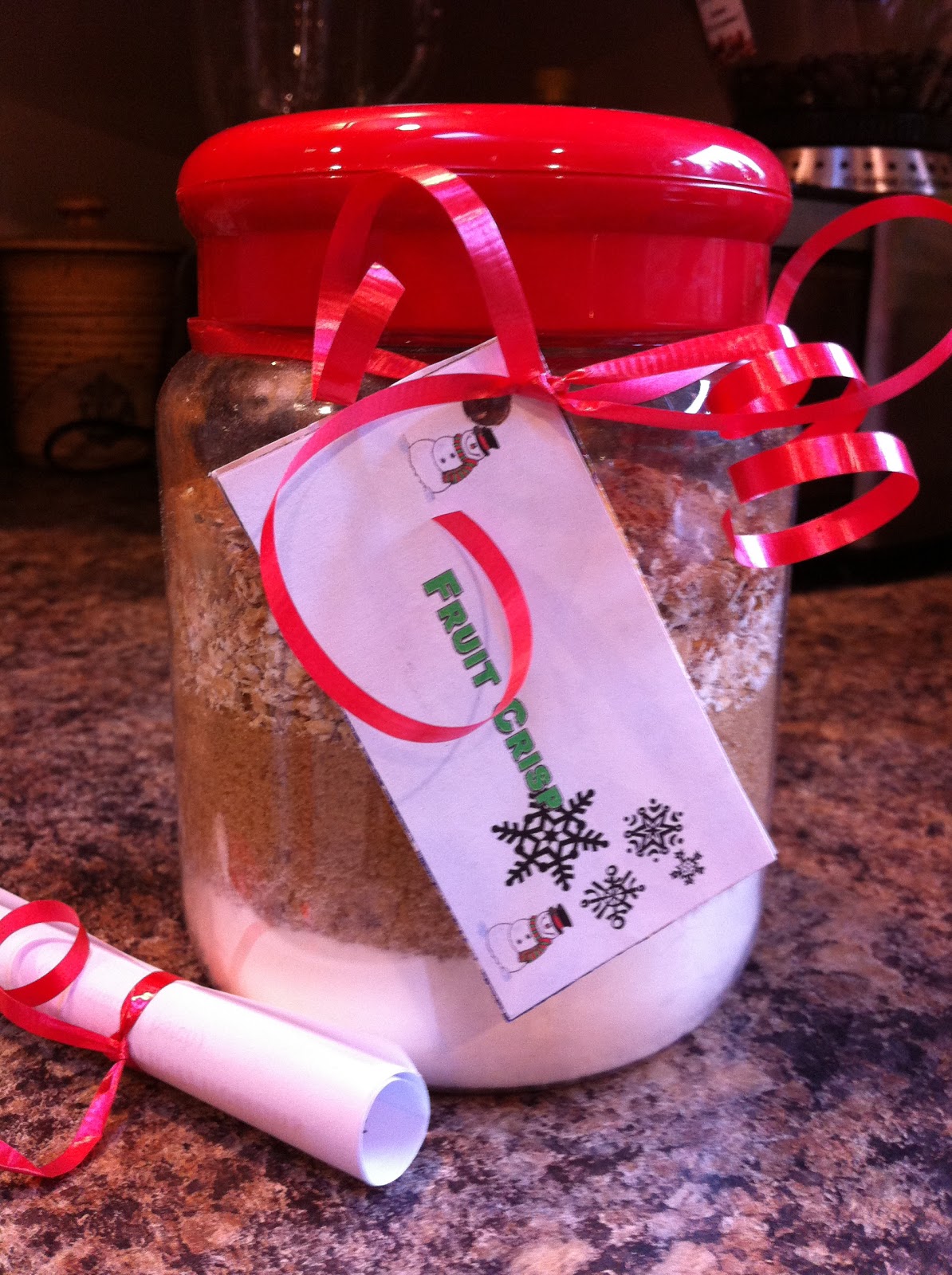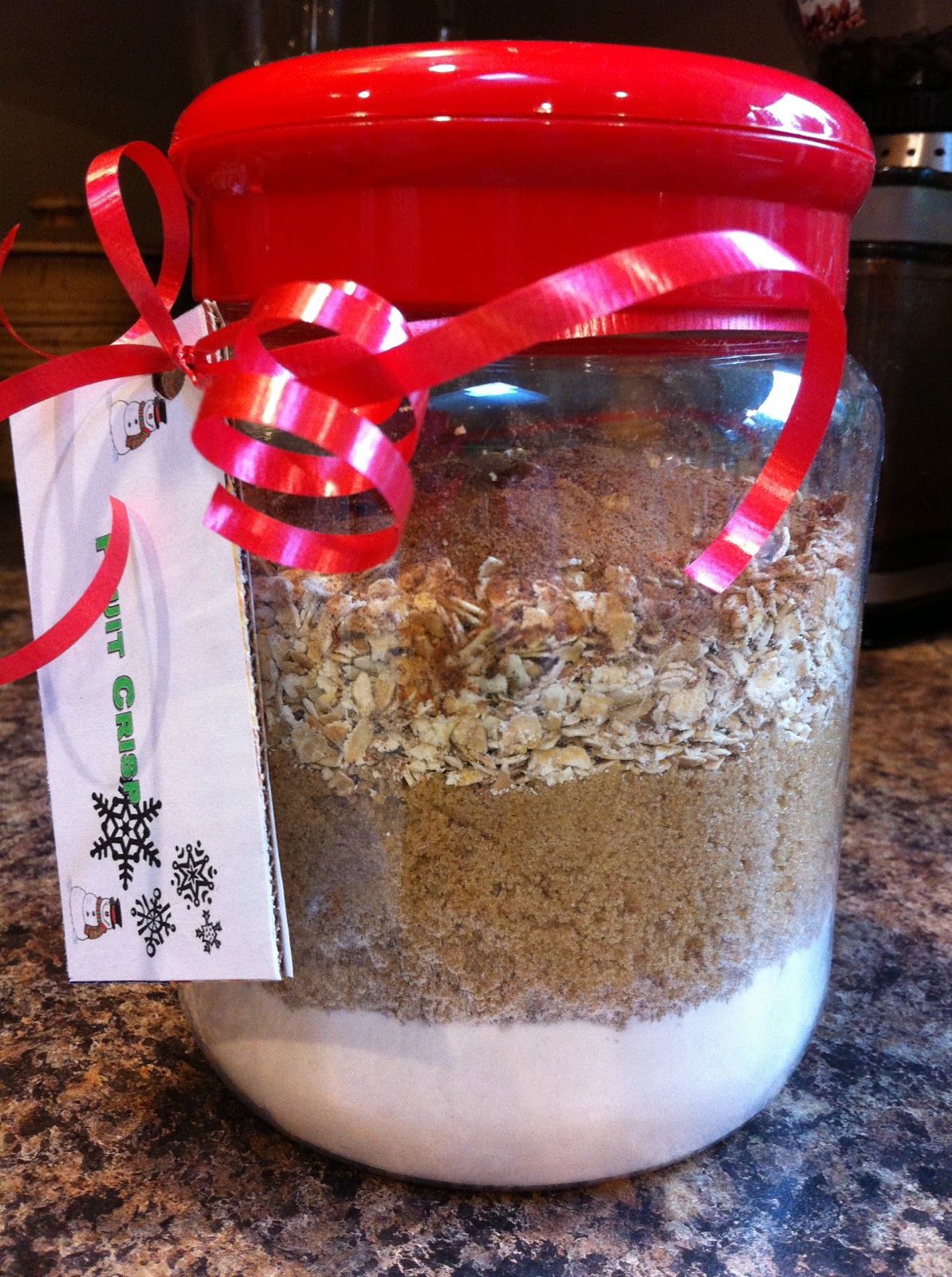 If I hadn't have been sick and feeling like I was dying while putting these things together I may just have used my own crumble topping recipe. But I decided to go with one that was listed for Gifts in a Jar, so this one actually is untested as the person I have given it to has yet to try it out. But really, I don't think you can go wrong with this sort of topping. Add some sugar, some oats, flour and cinnamon and you're good to go. I guess it's not a bad thing that I used this recipe, because when I make a crisp, I typically just throw ingredients in willy nilly without measuring and hope for the best.