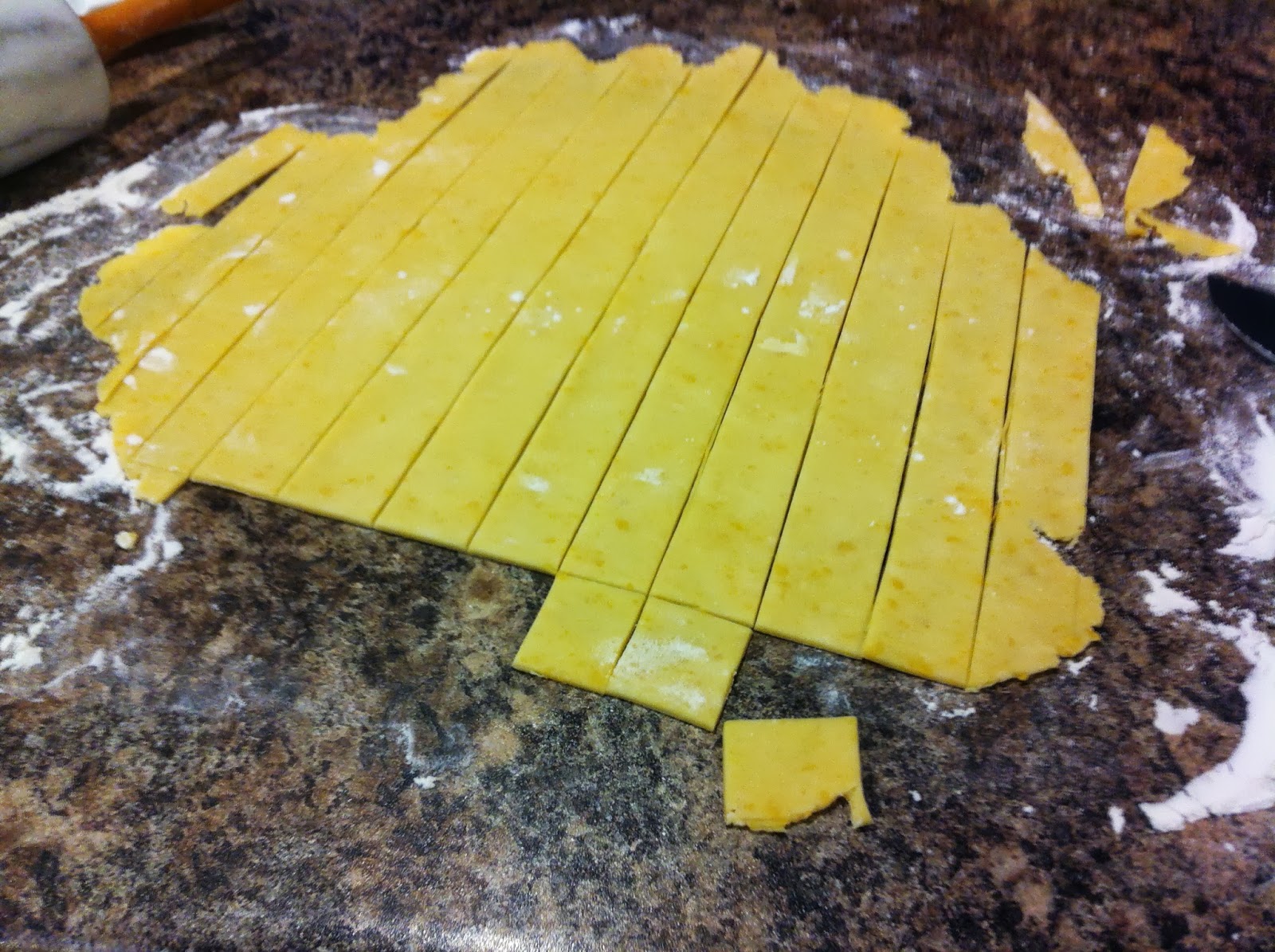 ~Roll out dough onto a floured surface to a 1/8 of an inch (when you think you have it thin enough, keep rolling)