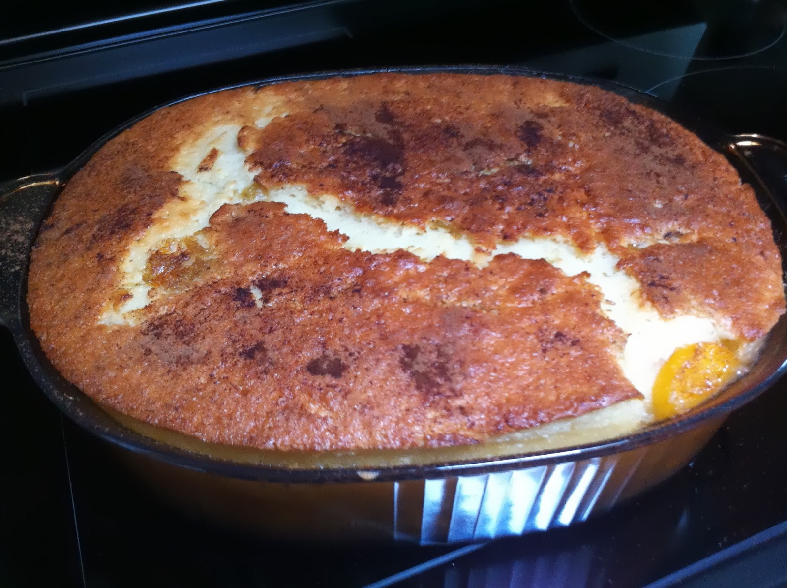 I didn't have enough peaches on hand (or so I thought). I wanted to double this recipe (wasn't necessary, it puffed up A LOT and almost overflowed the dish). So I used half peaches, half rhubarb (also because I had a lot of rhubarb to get rid of). So I just subbed out half of the peaches for rhubarb. Easy peasy. What I didn't expect to happen was for the rhubarb to completely vanish, and the peaches to stay whole. Of all things. If you were to hold a piece of peach and a piece of rhubarb in your hand, it would seem like a no brainer to say that the peach would dissolve and vanish during cooking. It is just so juicy and soft and moist, whereas the rhubarb is so hard. But that is not what happened. So my fruit layer was very much a white gooey syrup with a few peaches throughout. I can't wait to try this with all peaches though. Can't wait.